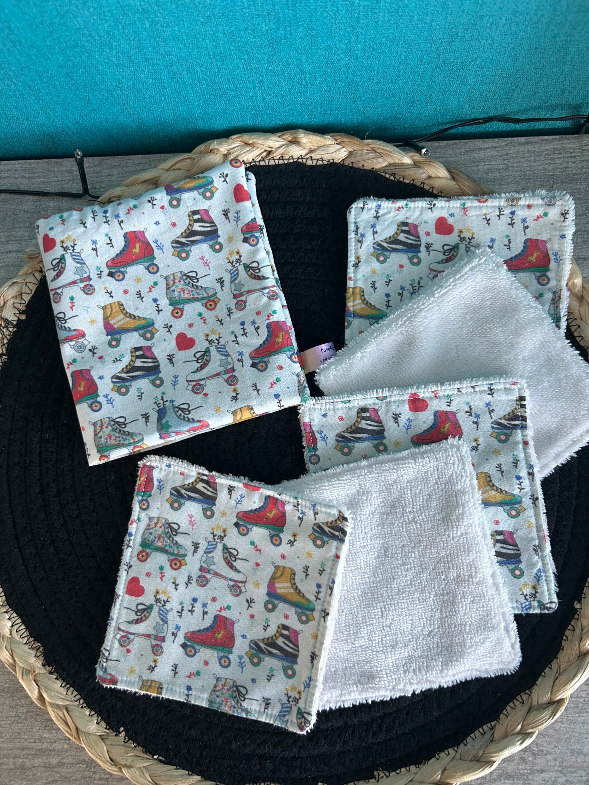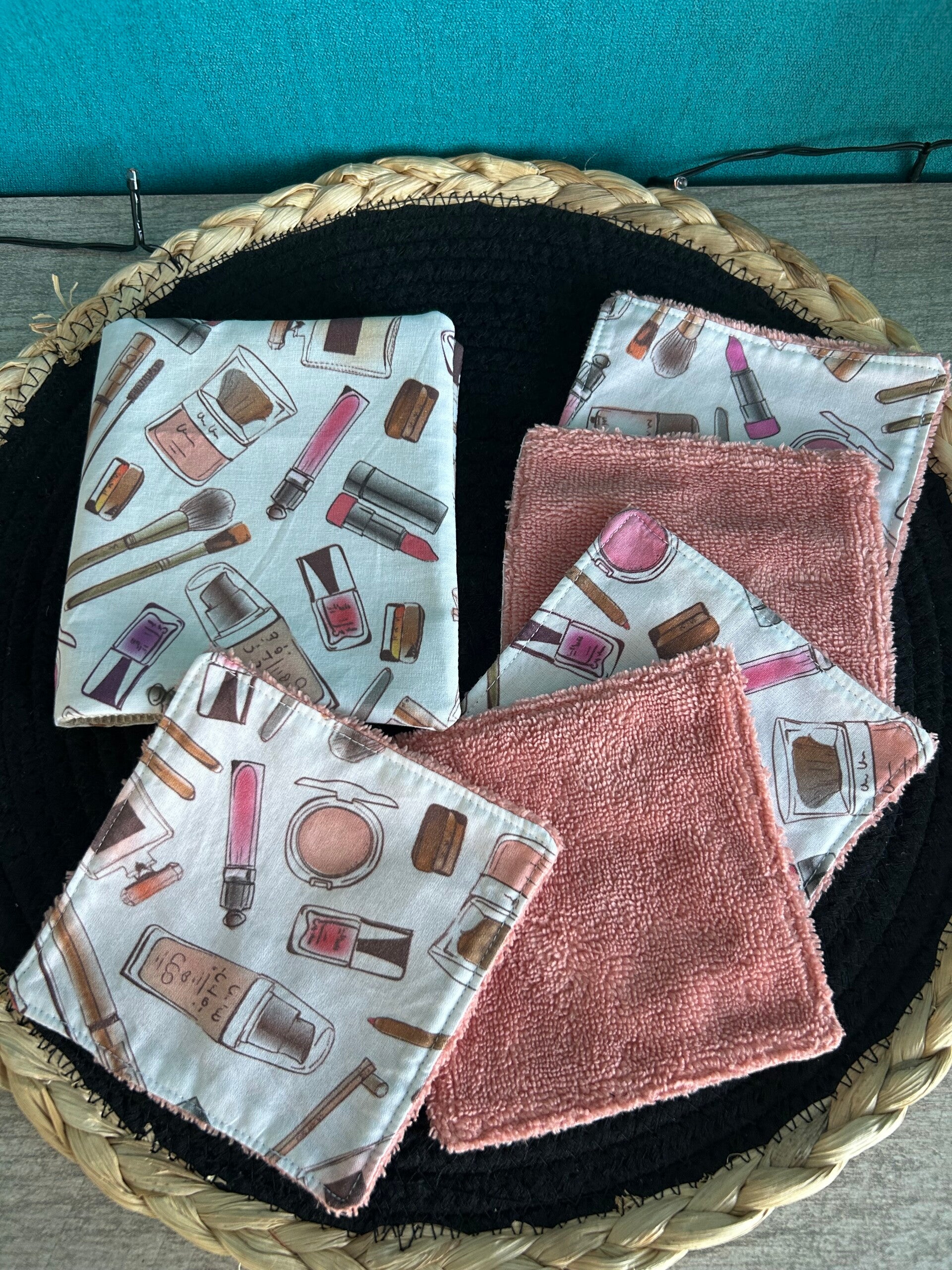 Se lot de 5 lingettes démaquillantes avec sa petite pochette de transport , petite et pratique .Les lingettes mesure 12 ×12cm .