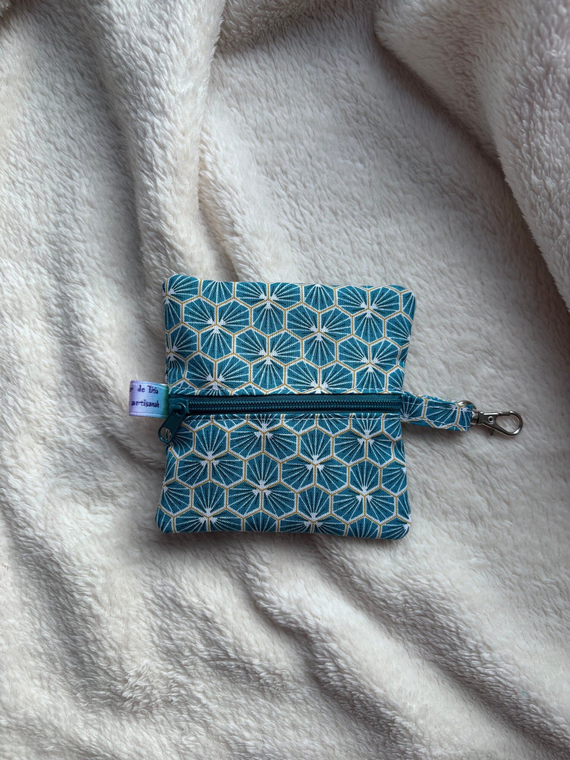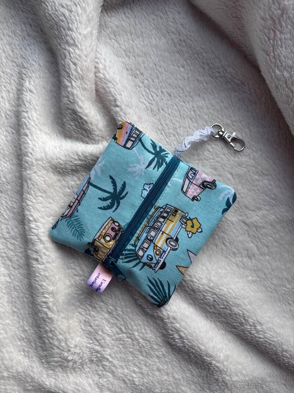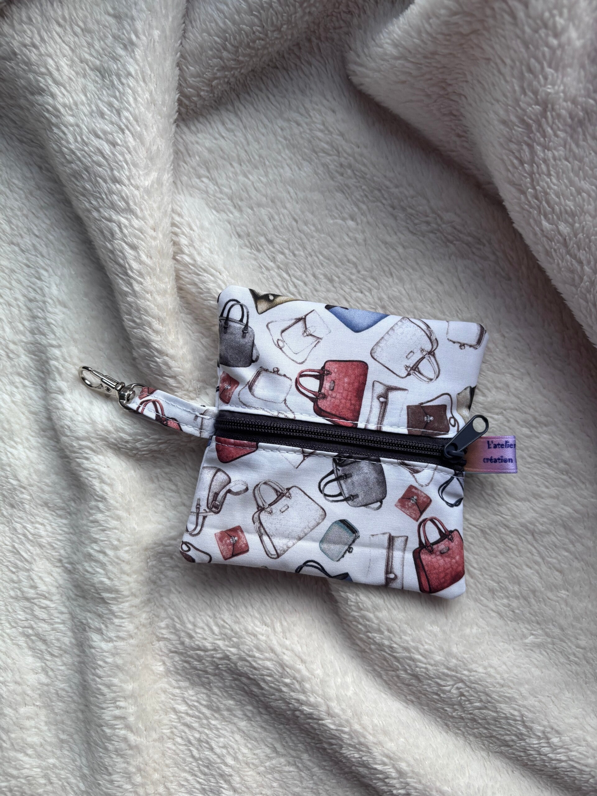 petite pochette de forme ronde avec fermeture éclair , utilisée en porte monnaie ou comme pochette de rangement d'écouteurs ou autre.