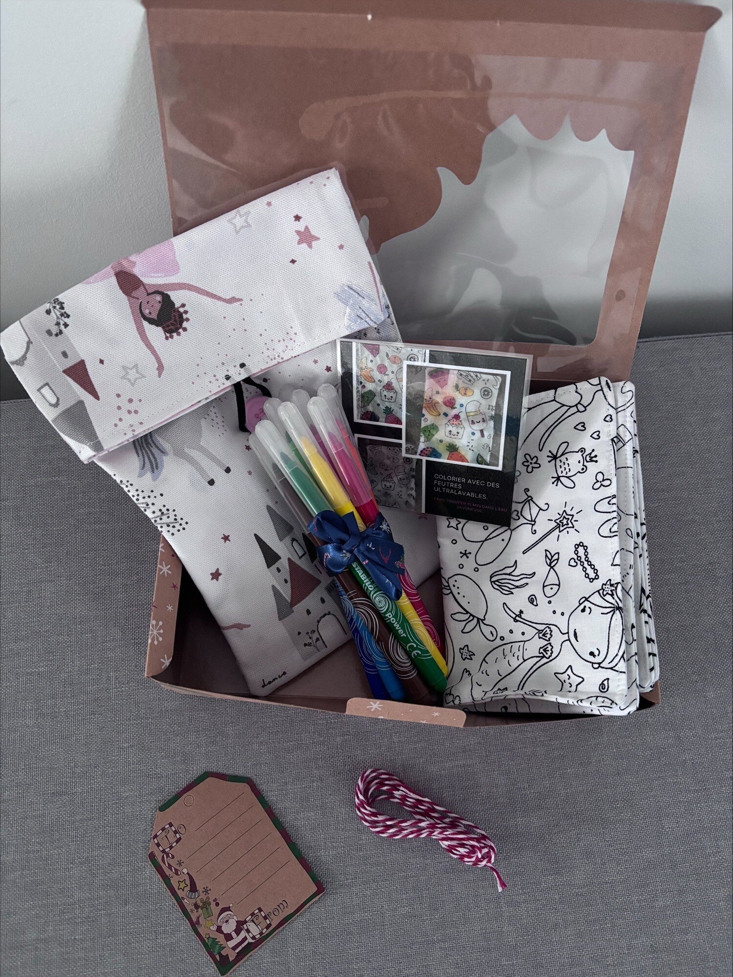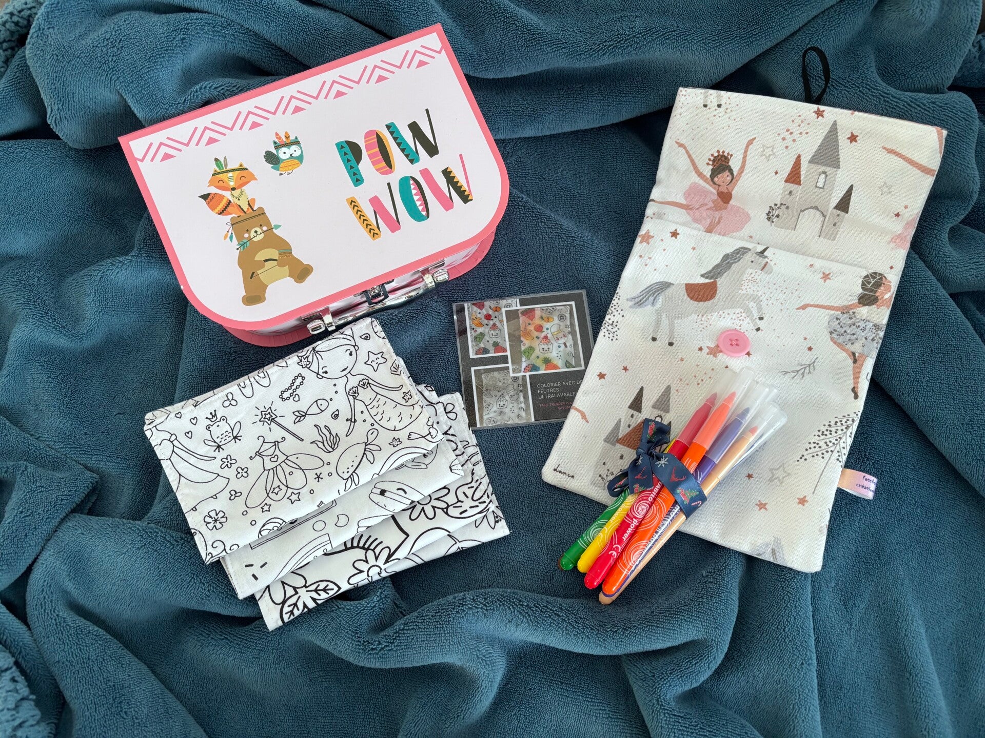 je vous propose une pochette pour y glisser 4 feuilles recto verso à colorier lavables et réutilisables ainsi vous pouvez y glisser des feutres lavables pour vos sorties. (feutres ultralavables fournis)