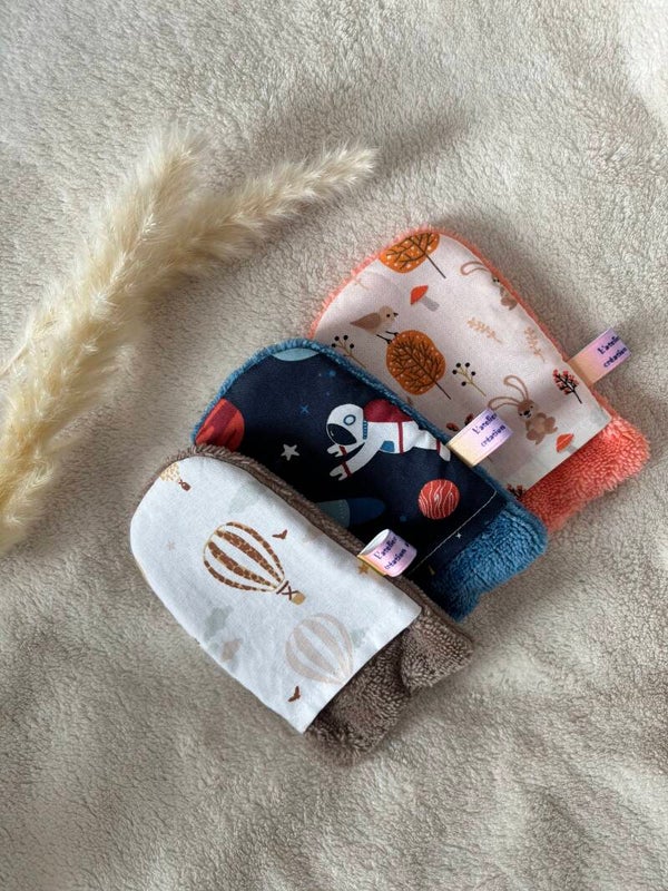 Adaptés à la main d'un enfant, ces gants leur permettent de se débarbouiller tout seuls rapidement !
